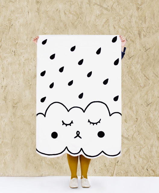 Zakochałam się w tych kształtach i grafikach - "zwykły", typowy koc-prostokąt potraktowano z dziecięcą wyobraźnią: bez barier, ograniczeń. Brzeg wycięty w kształt chmurki? Proszę uprzejmie! Frędzle w rogach albo pomponiki wzdłuż jednego z boków? Nie ma sprawy! Tutaj fantazja bawi się formą, a nożyczki i farba pokazują, że nie ma rzeczy niemożliwych.